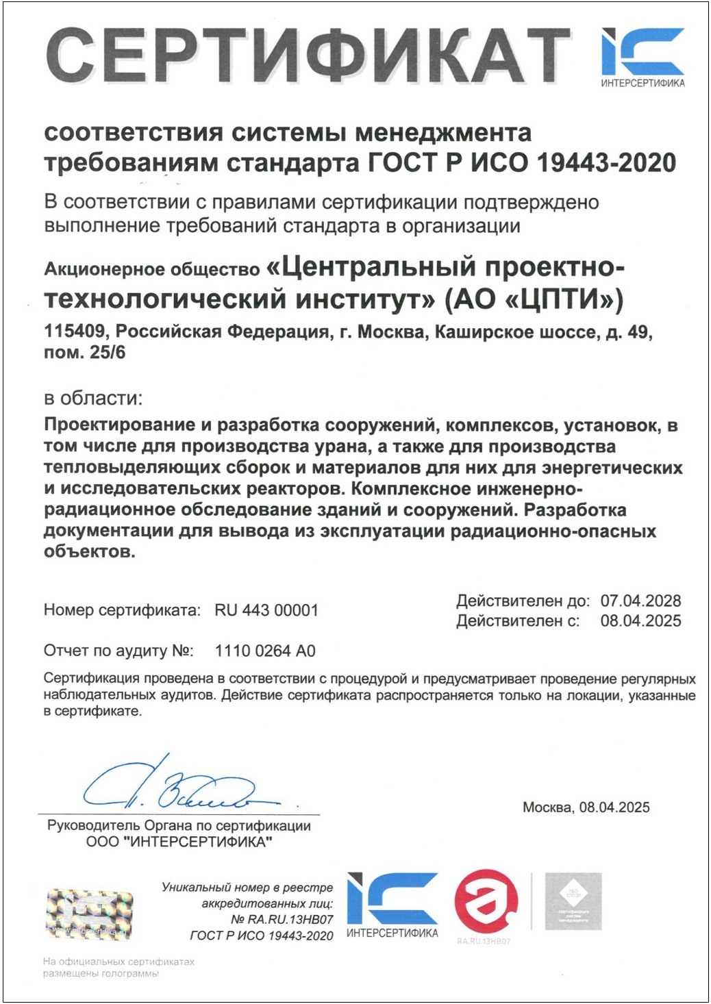 Специалисты Центрального проектно-технологического института (АО «ЦПТИ», предприятие Топливного дивизиона «Росатома») впервые прошли сертификацию системы менеджмента качества на соответствие требованиям стандарта ГОСТ Р ИСО 19443-2020.
